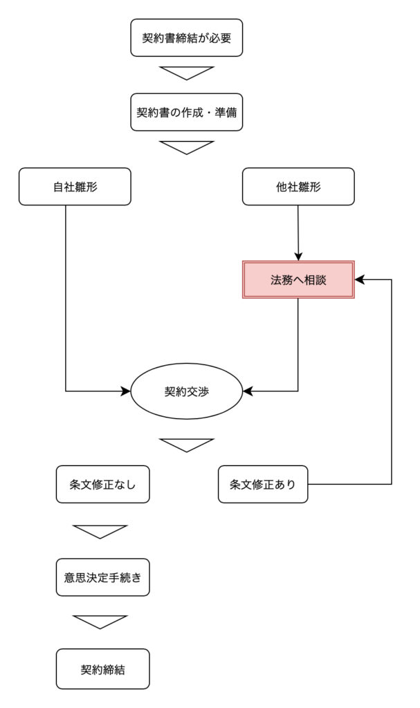例えば、以下のフローチャートでは、契約書締結までの業務の中にどの場面で法務部門が関わってくるかが明示されているかと思います。